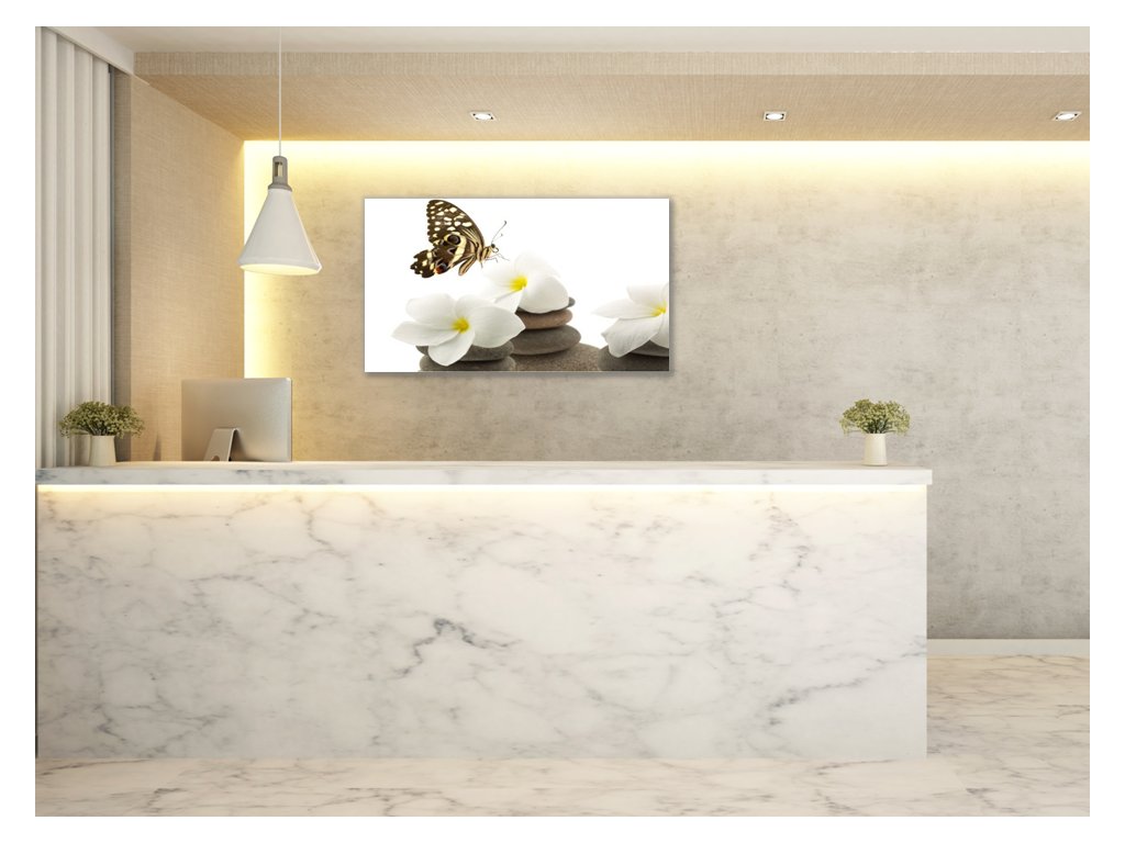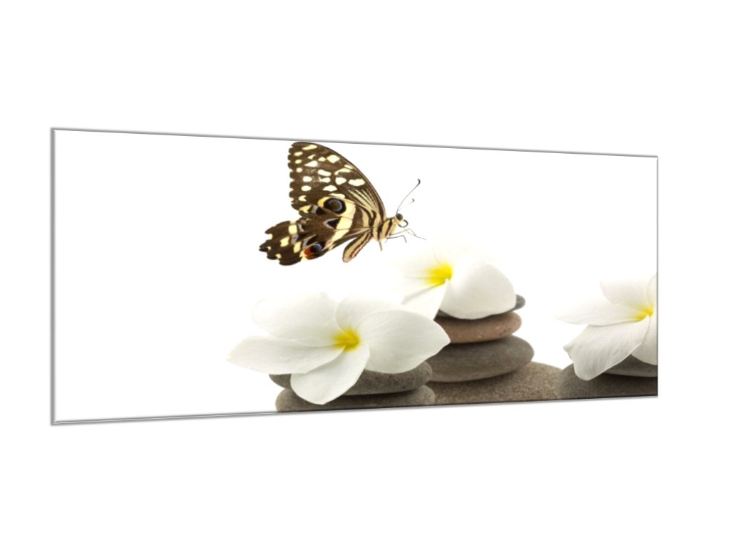 Obraz skleněný bílé květy, motýl, oblázky