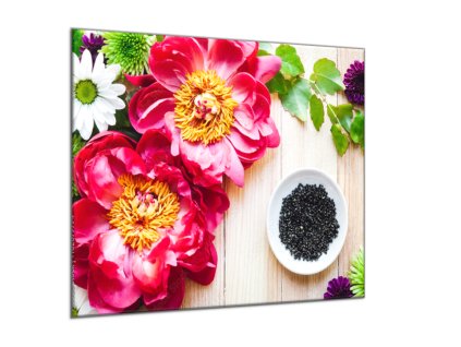 Obraz skleněný čtvercový květy pivoňky a chryzantémy na dřevě