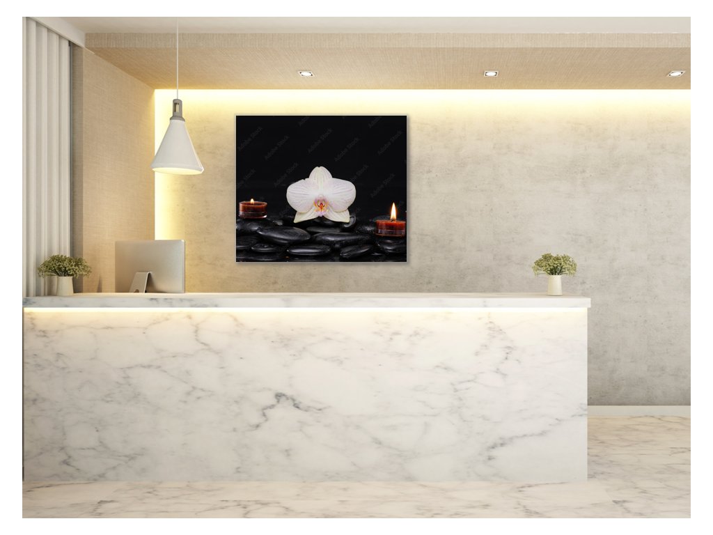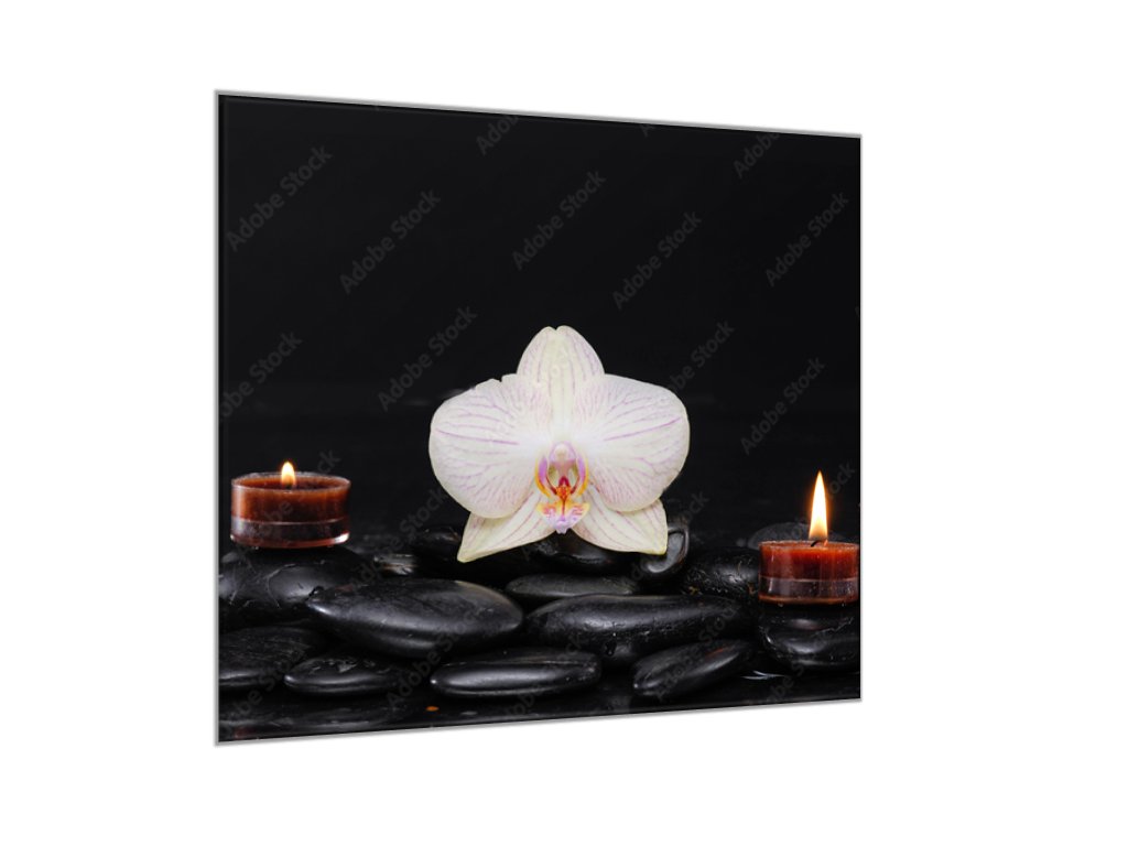 Obraz skleněný čtvercový květ bílá orchidej na kamenech a svíčky