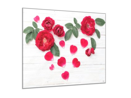 Obraz skleněný čtvercový květy červené růže a lístky na bílém dřevě