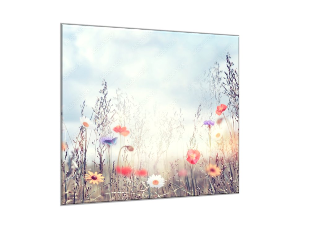 Obraz skleněný čtvercový malované luční kvítí a tráva, modré nebe