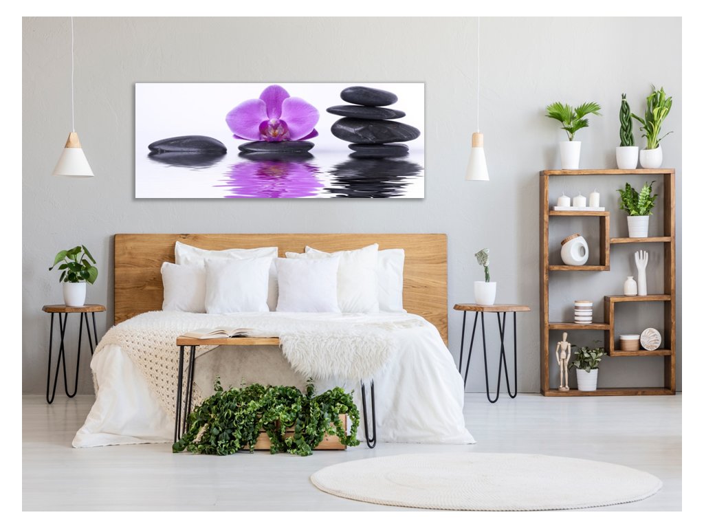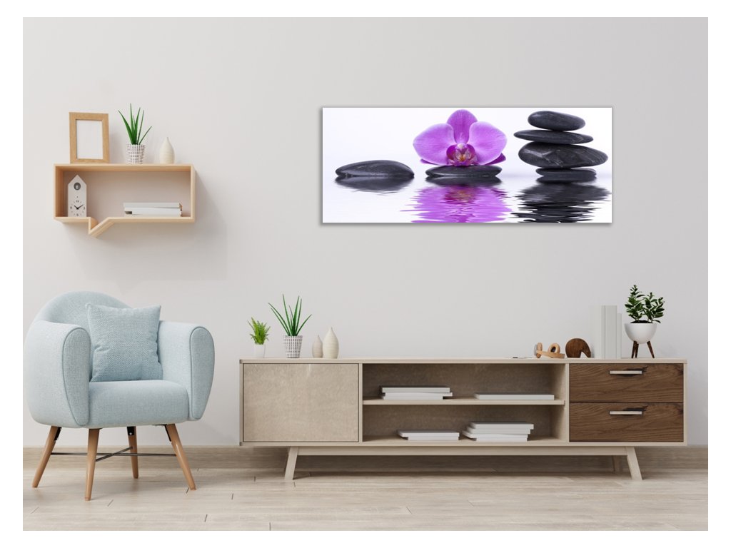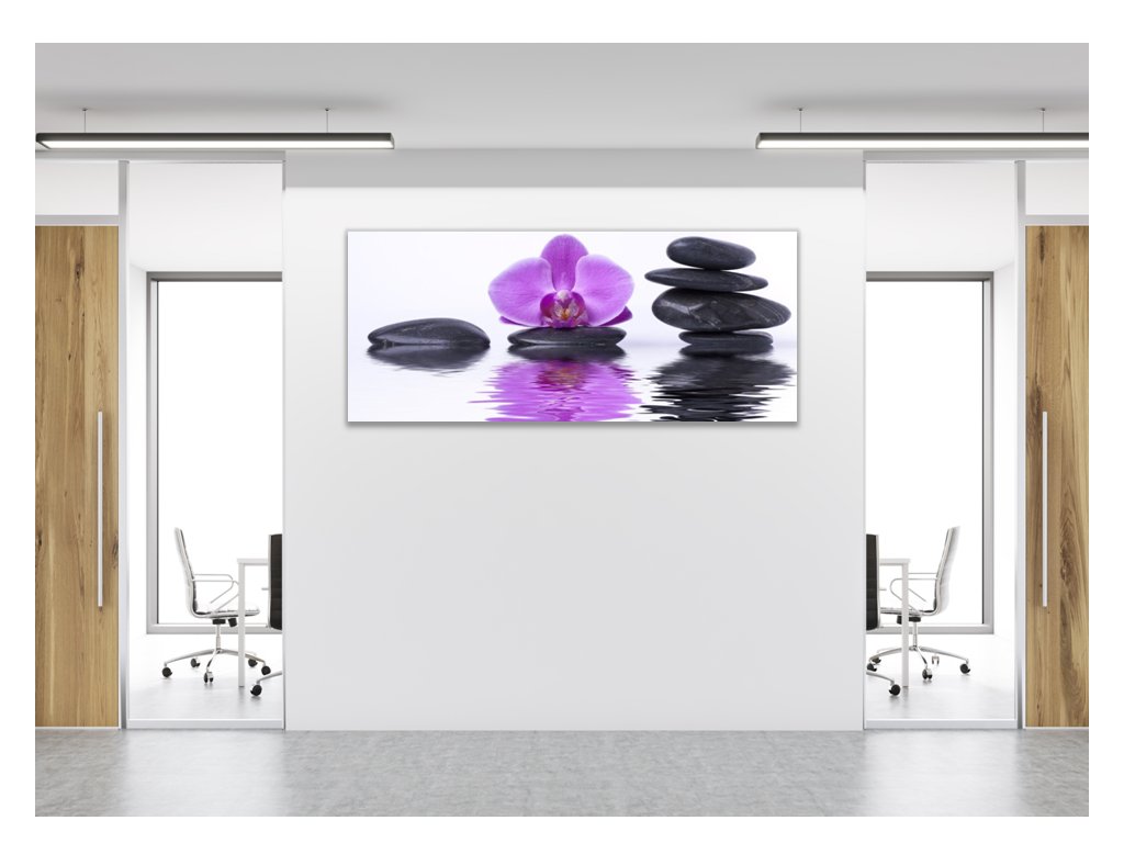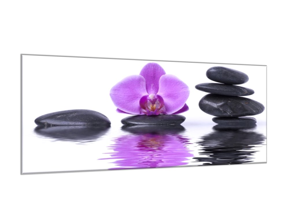 Obraz skleněný květ fialová orchidej na hladině vody s kameny