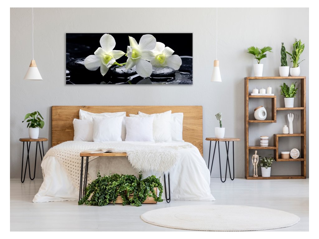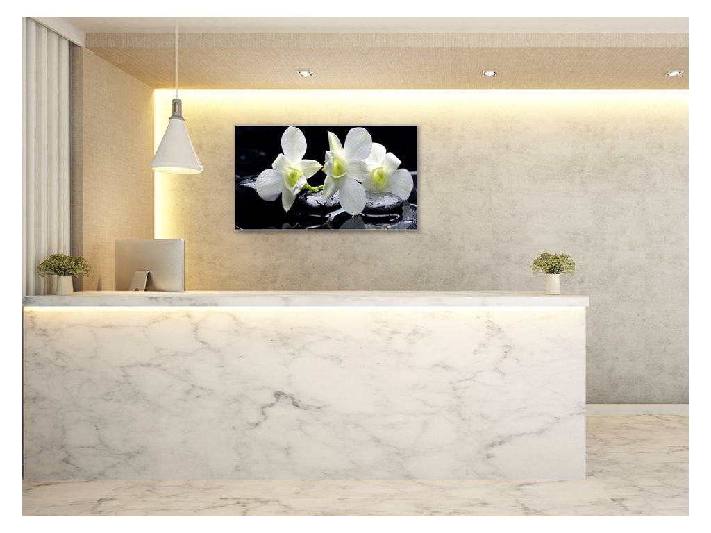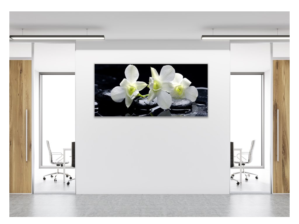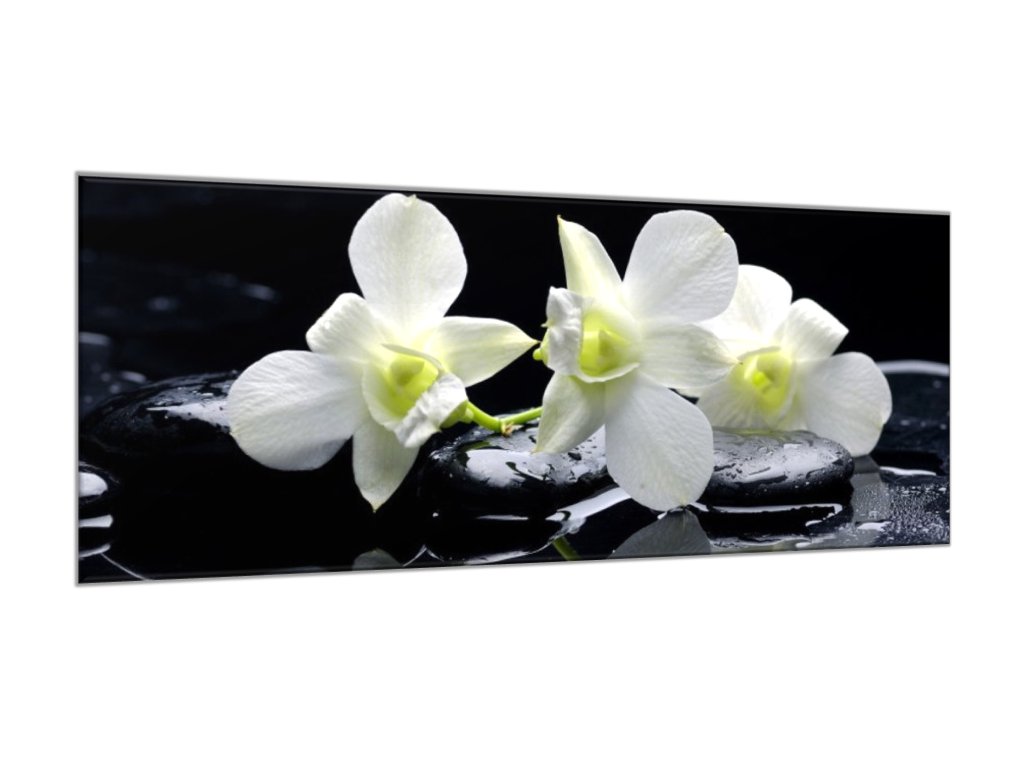 Obraz skleněný květy bílá orchidej na černém kameni