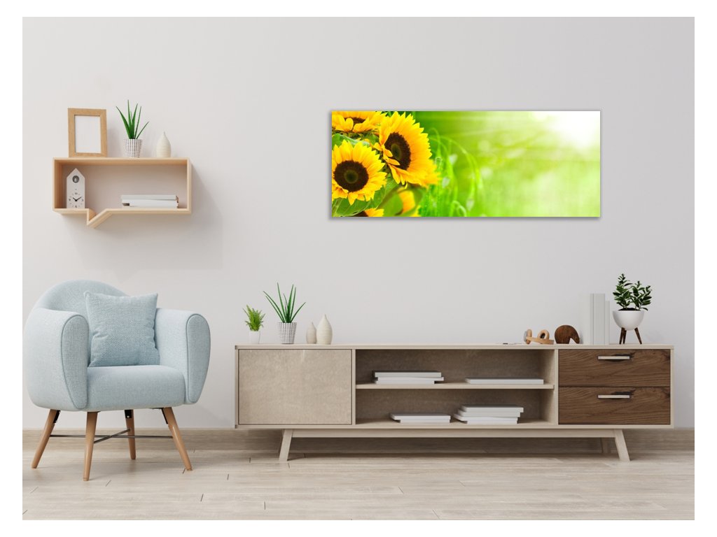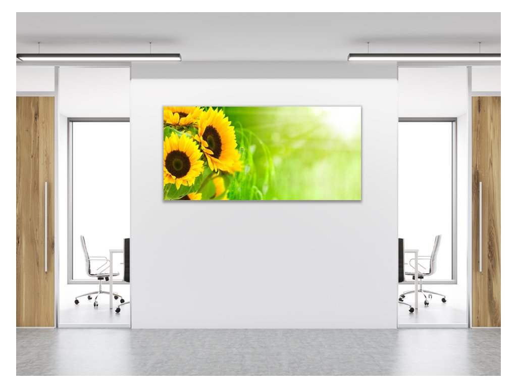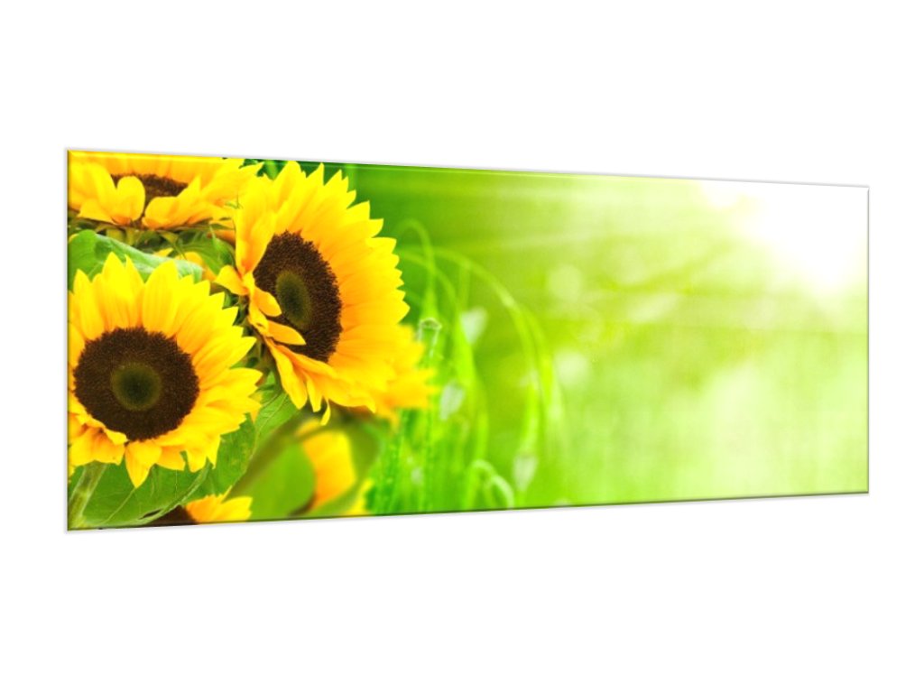 Obraz skleněný květy slunečnice na zeleném pozadí