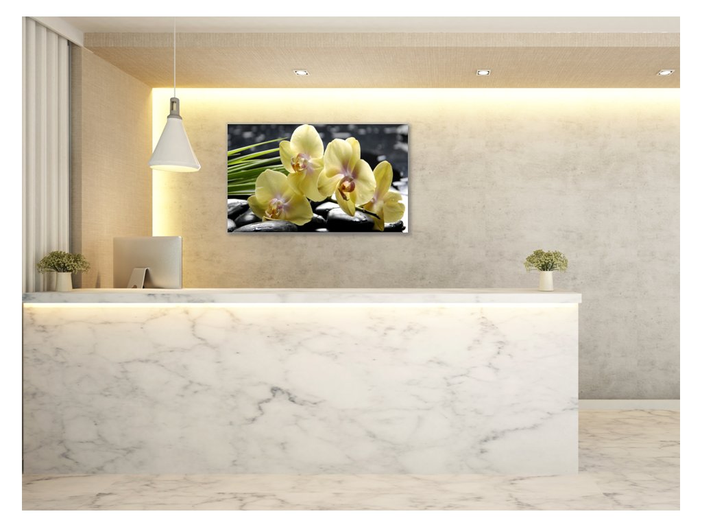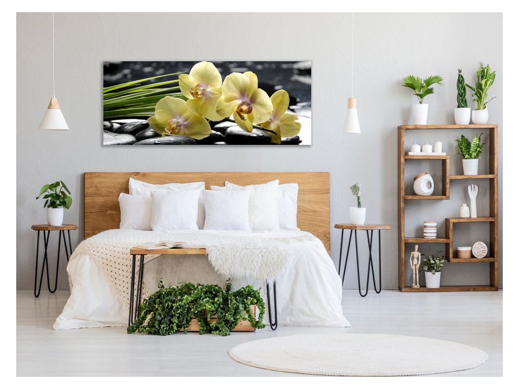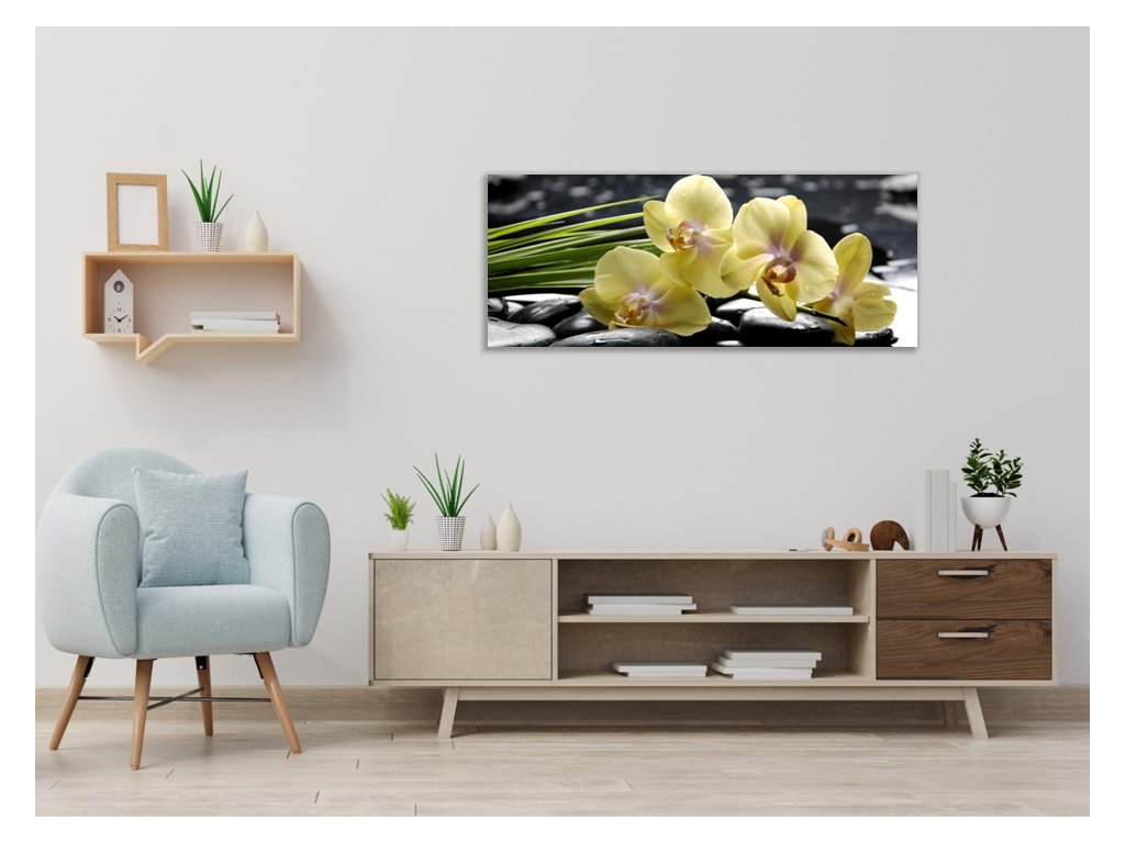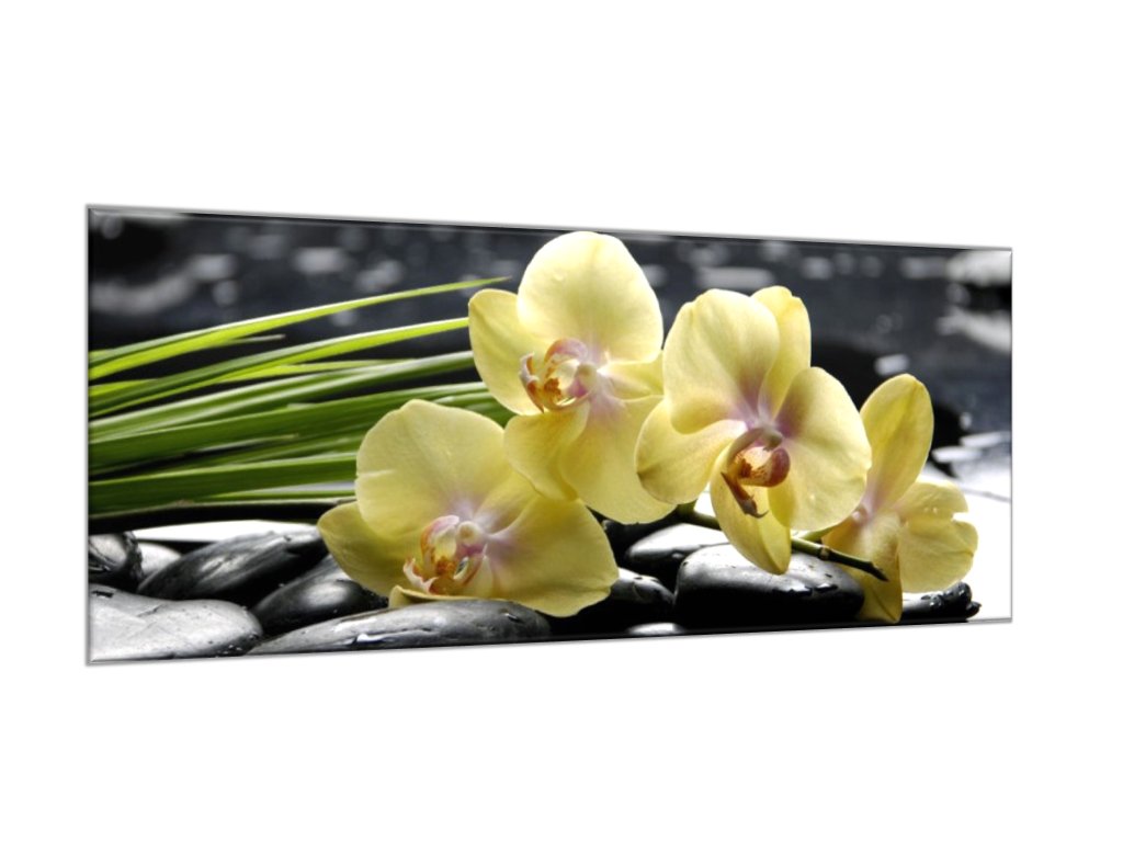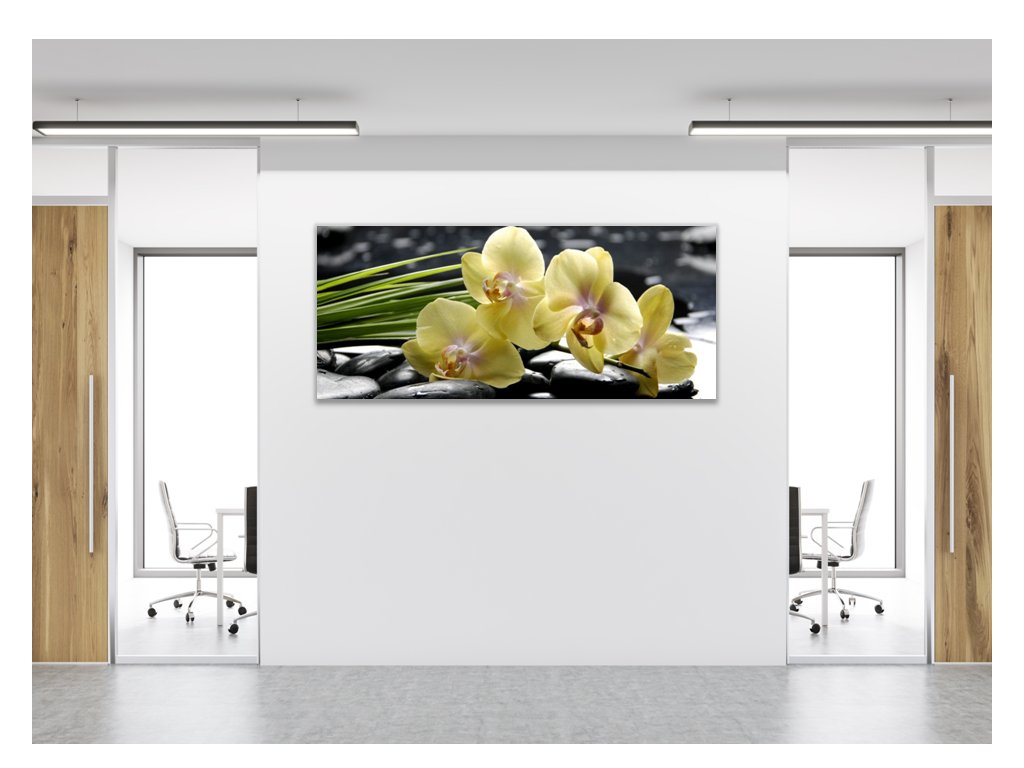 Obraz skleněný květy žlutá orchidej na černých kamenech