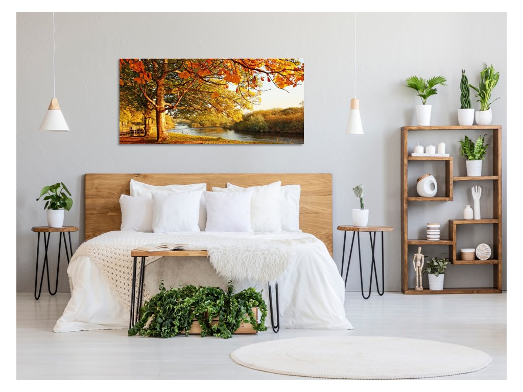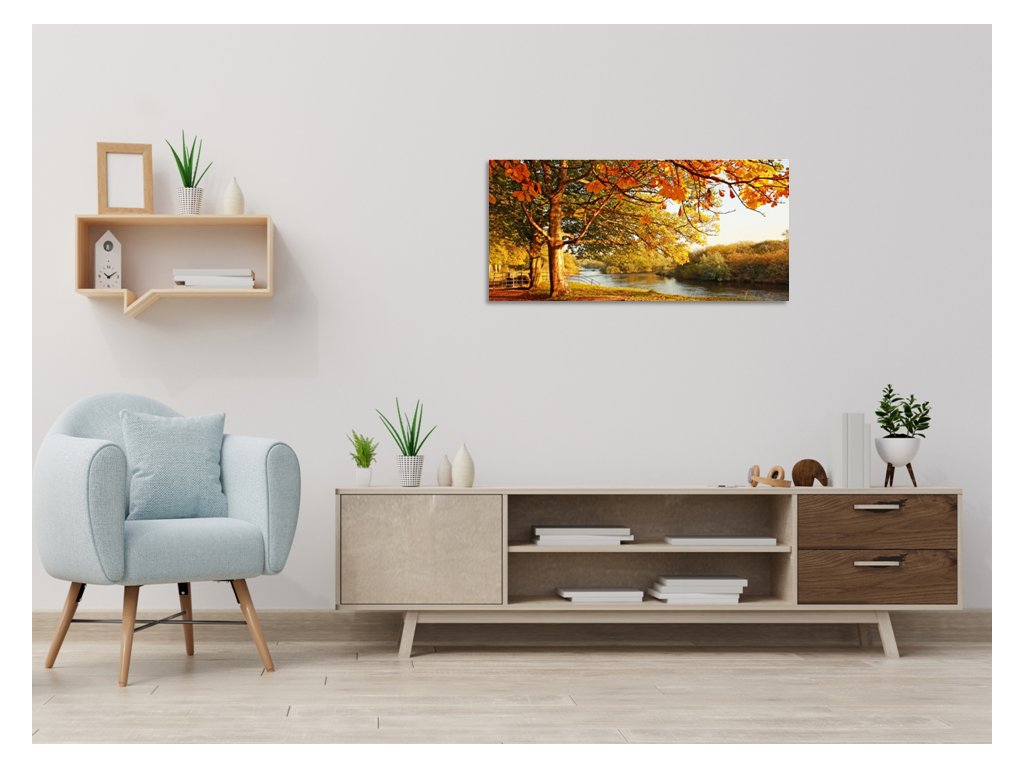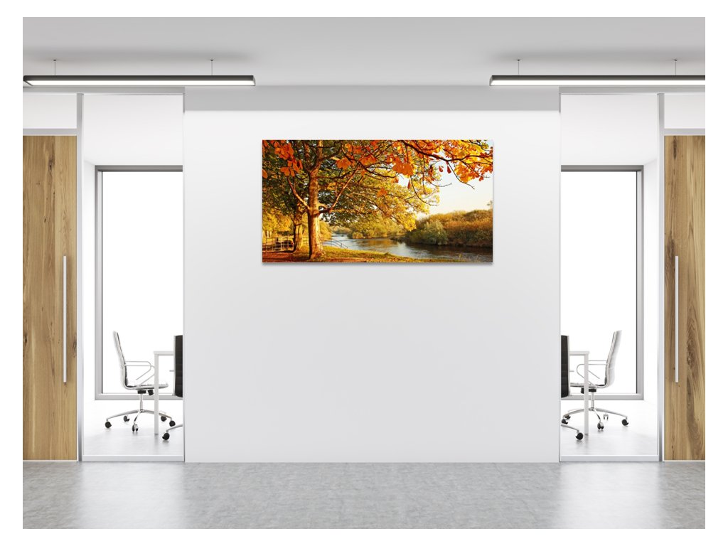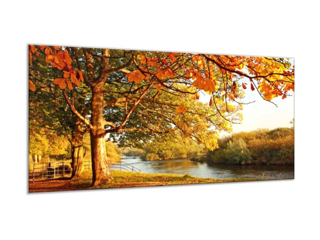 Obraz skleněný podzimní strom s lavičkou u řeky