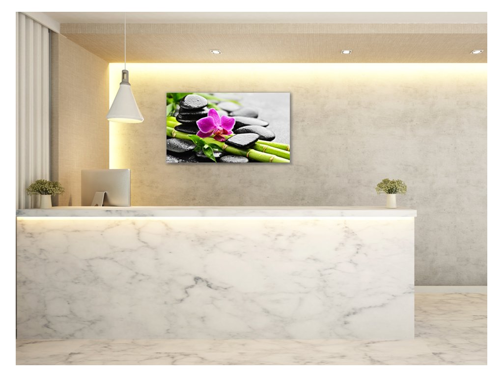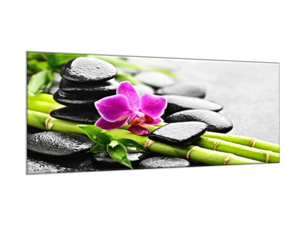 Obraz skleněný růžová orchidej, bambus, kameny