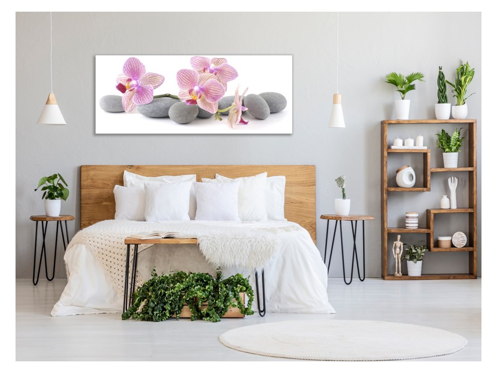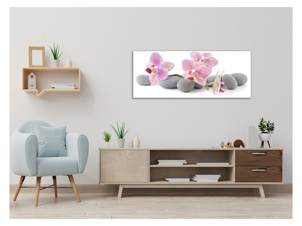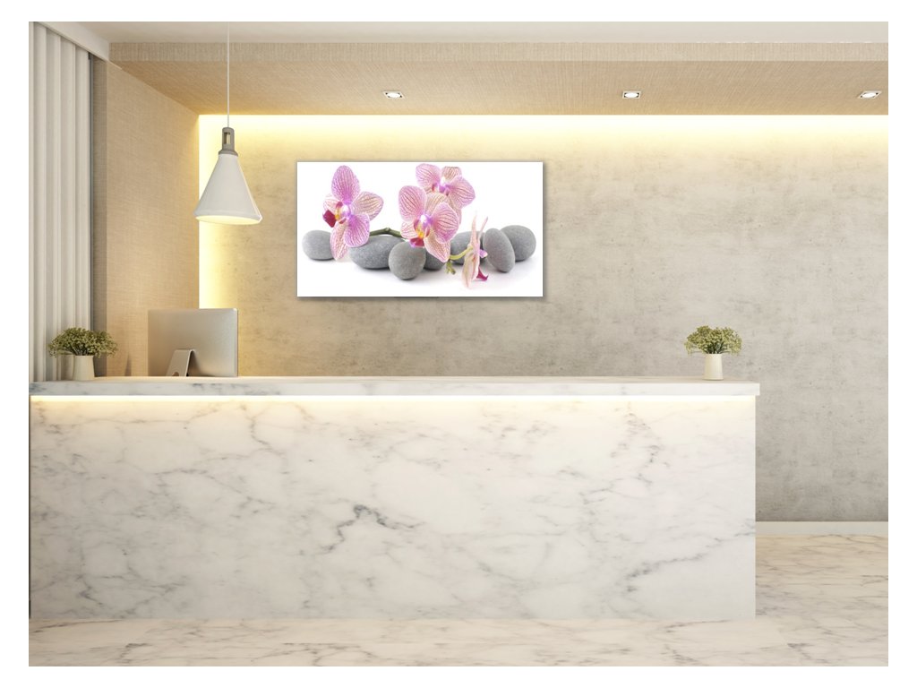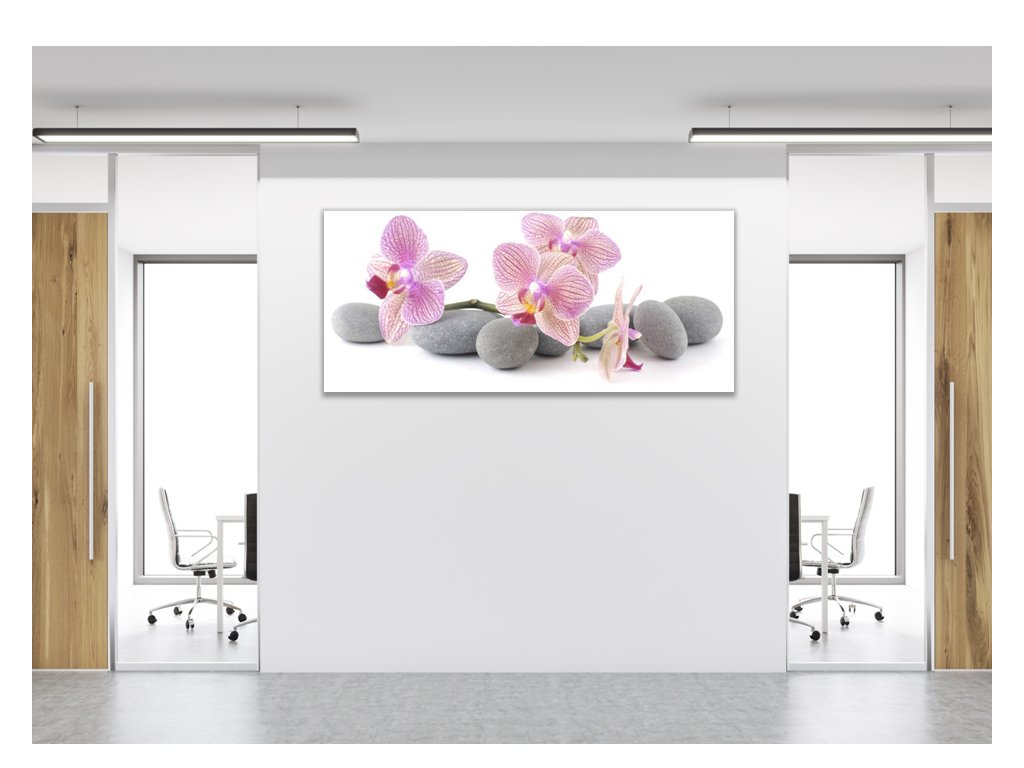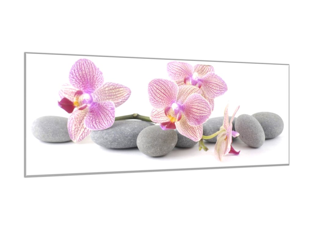 Obraz skleněný růžové květy orchidejí na šedých kamenech
