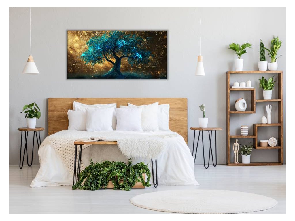 Obraz skleněný strom s třpytivými tyrkysovým modrými listy