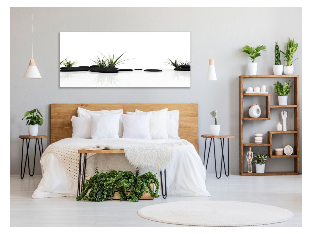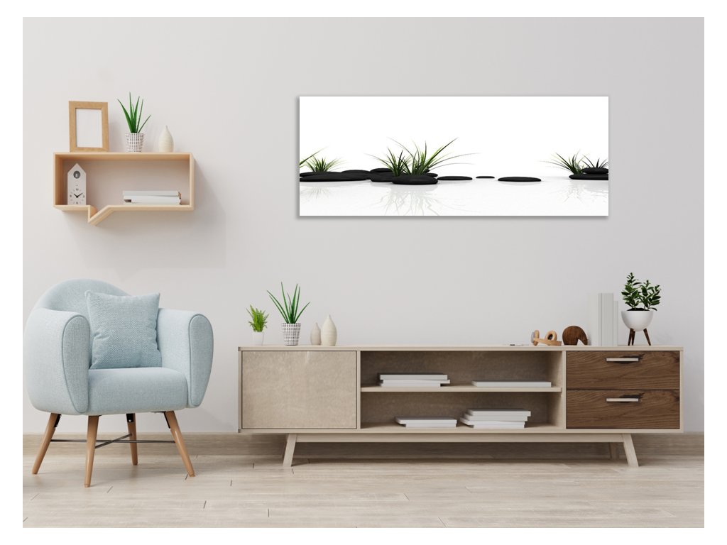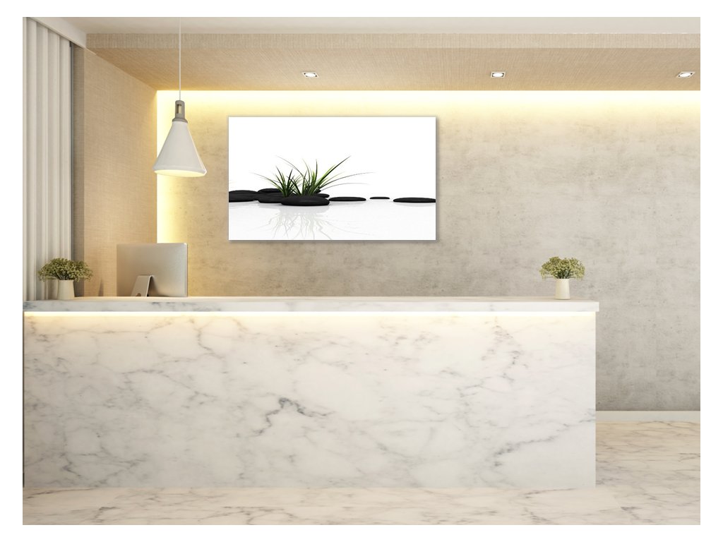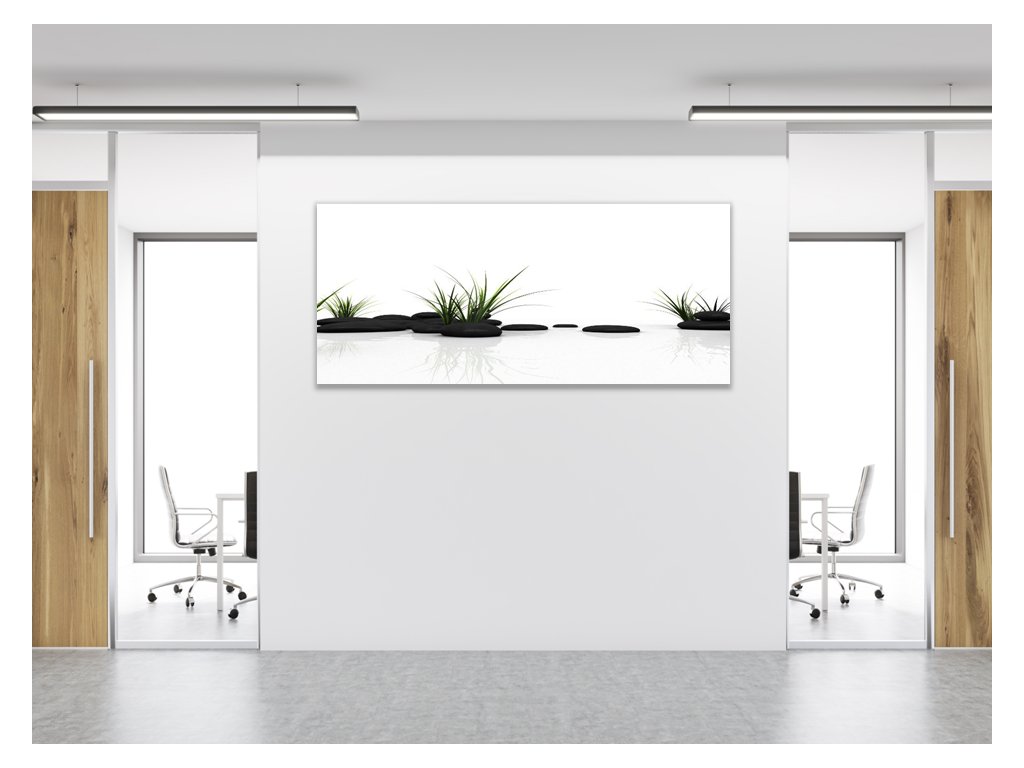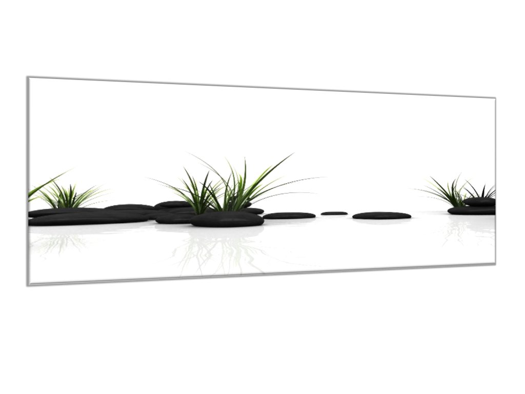 Obraz skleněný tráva a černý kámen na bílém pozadí