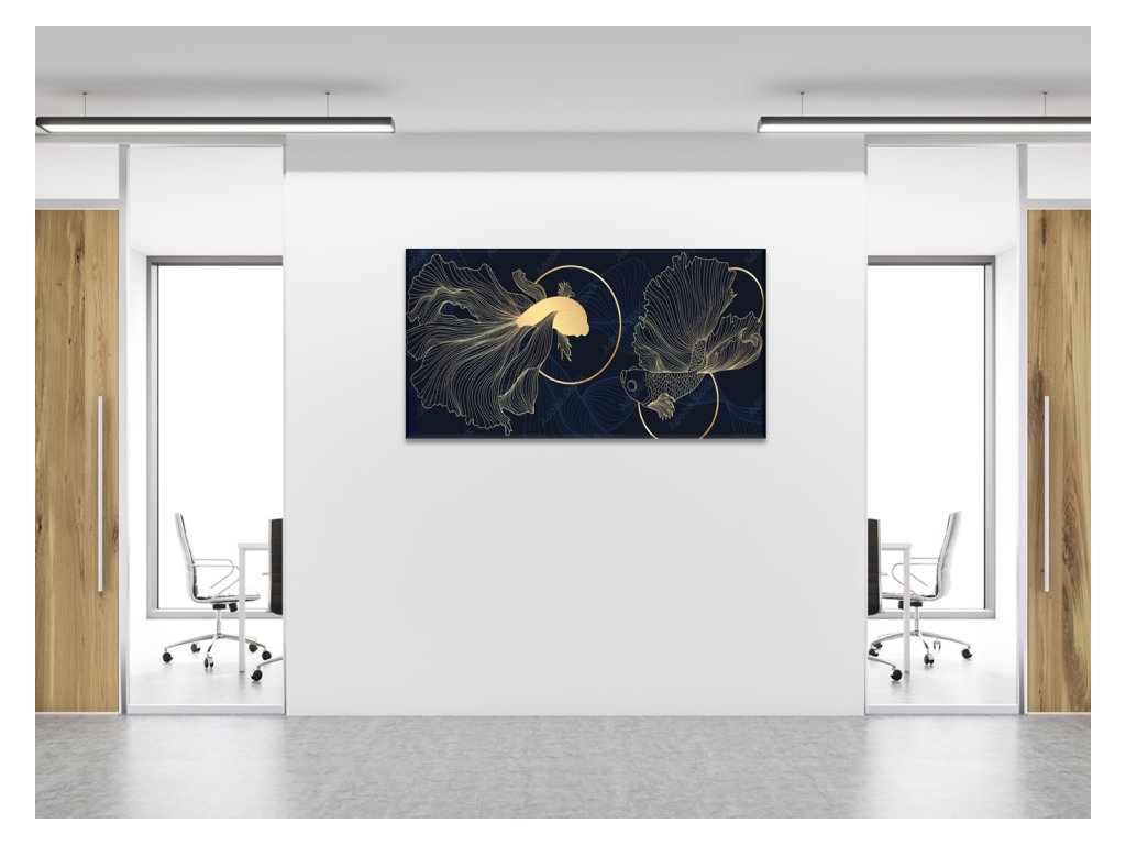 Obraz skleněný zlatá perokresba ryby na tm. modrém pozadí