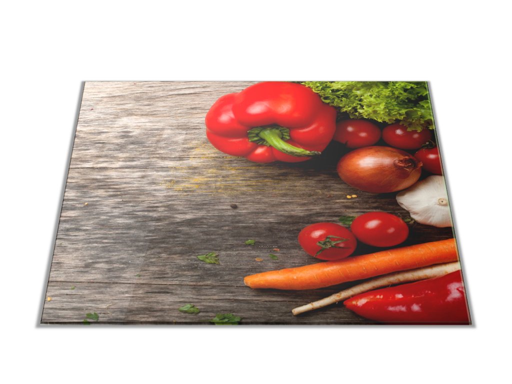 Skleněné prkénko čerstvá zelenina na dřevě