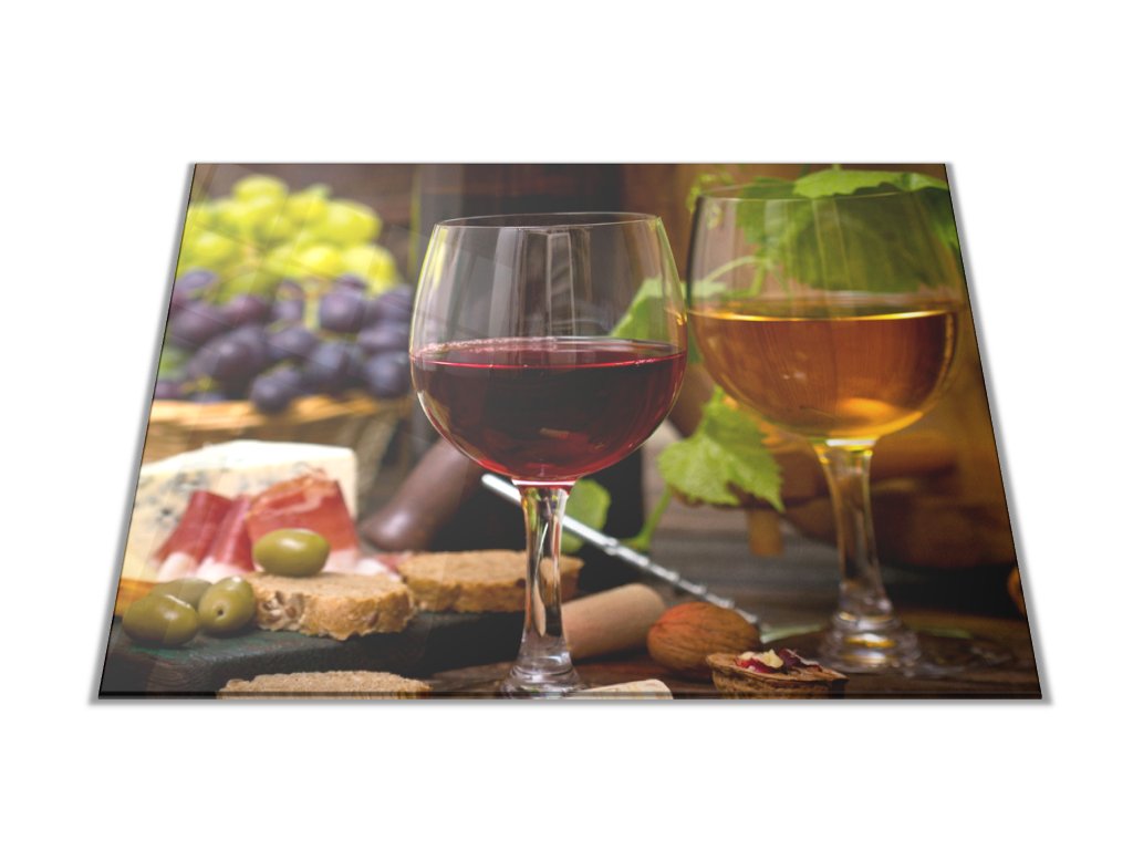 Skleněné prkénko dvě sklenice vína a pochutiny