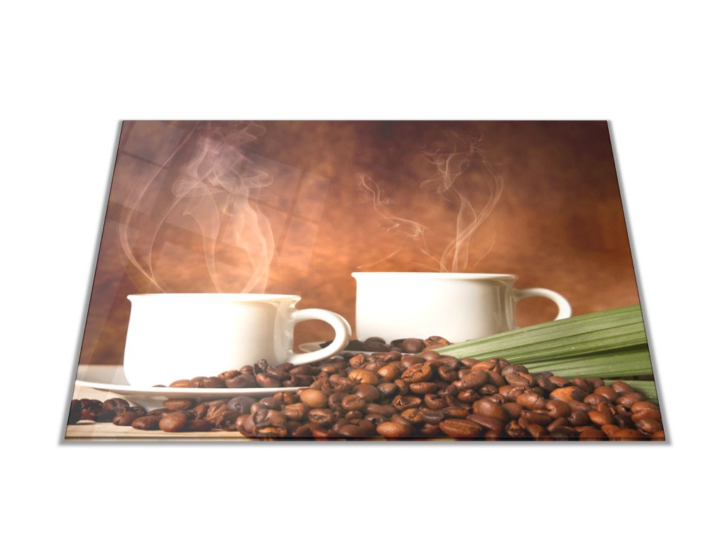 Skleněné prkénko káva a dva bílé hrníčky