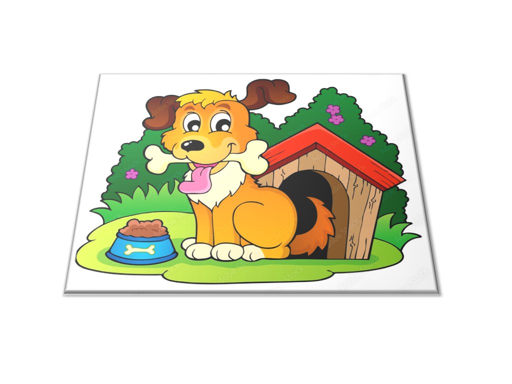 Skleněné prkénko malované pes s kostí u boudy