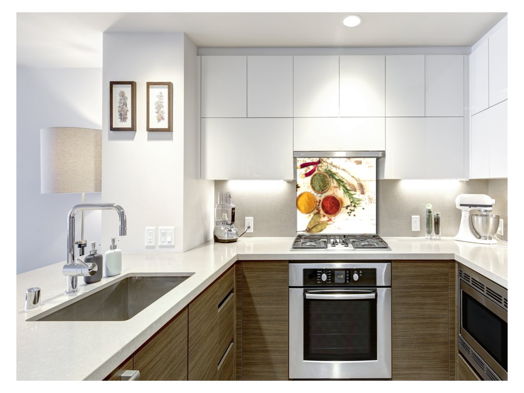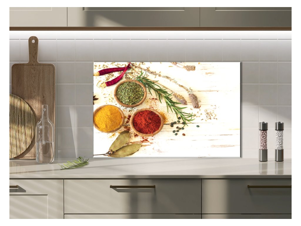 - použití: skleněný panel do kuchyně je vhodný za varné centrum elektrické, indukci i plynové. V případě umístění za plynovou varnou desku doporučujeme minimální vzdálenost 15 cm od hořáků, popř. nepouštět naplno a udržovat plamen pod hrncem hlavně u velkého hořáku. V případě nedodržení instrukcí, může dojít k poškození potisku či barvy výrobku