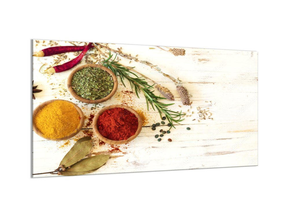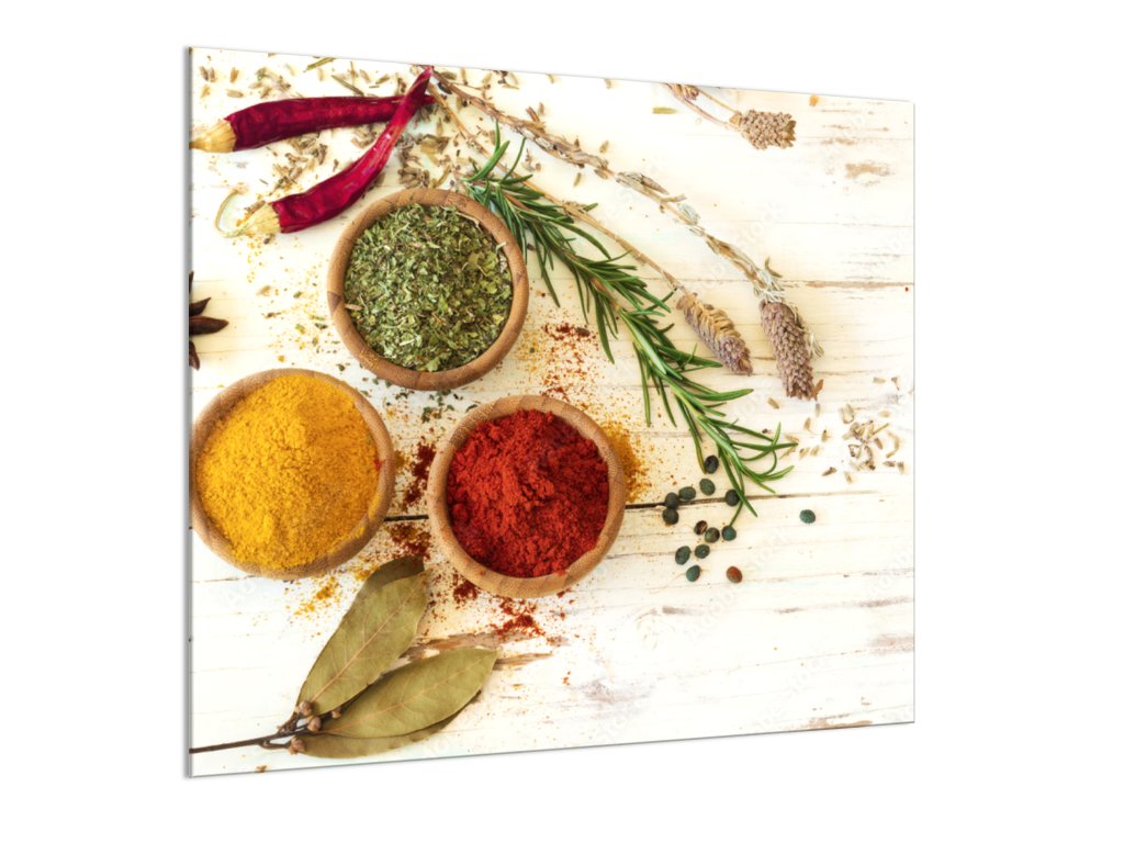 Skleněný obklad do kuchyně koření na bílém dřevě
