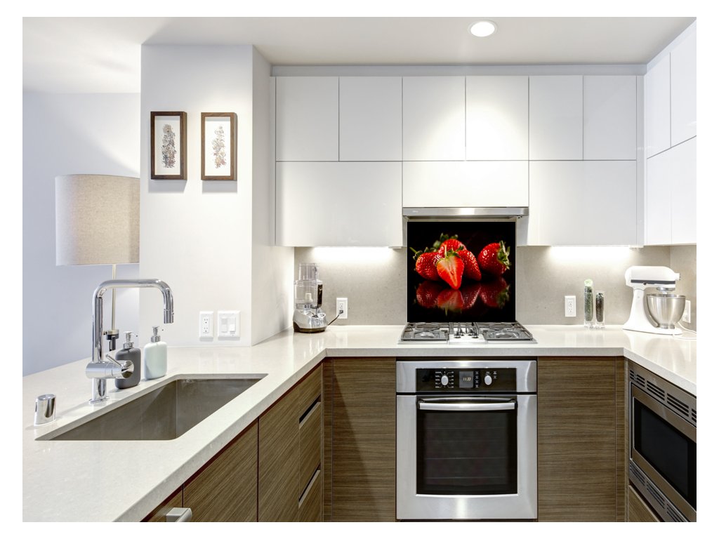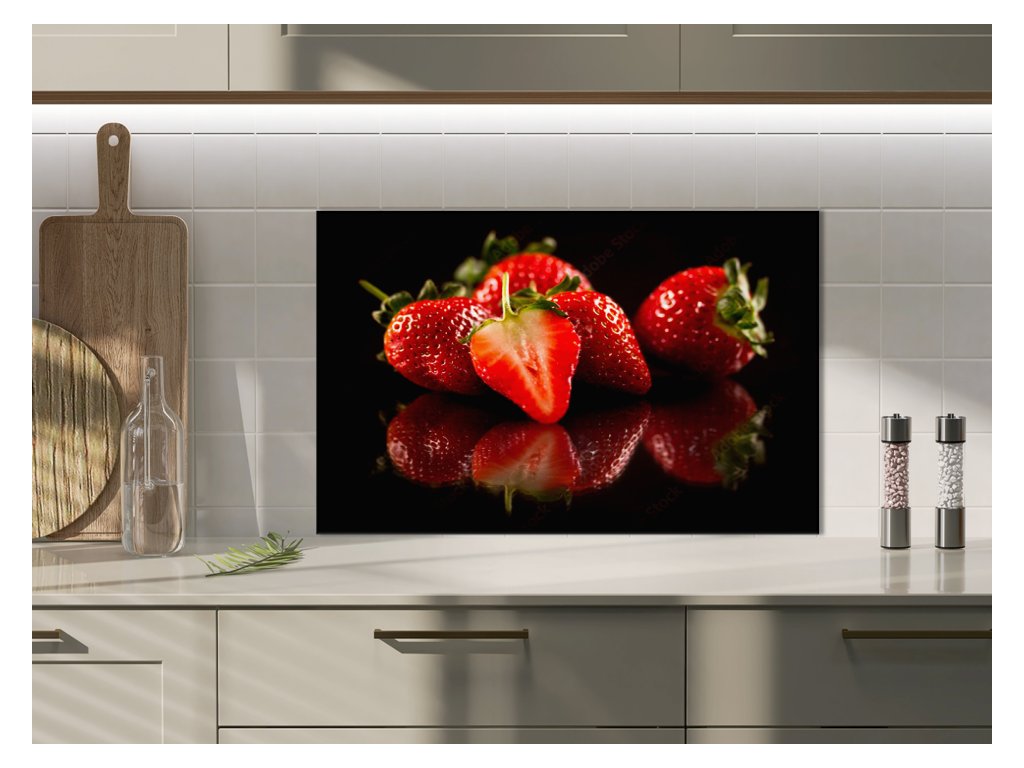 - použití: skleněný panel do kuchyně je vhodný za varné centrum elektrické, indukci i plynové. V případě umístění za plynovou varnou desku doporučujeme minimální vzdálenost 15 cm od hořáků, popř. nepouštět naplno a udržovat plamen pod hrncem hlavně u velkého hořáku. V případě nedodržení instrukcí, může dojít k poškození potisku či barvy výrobku