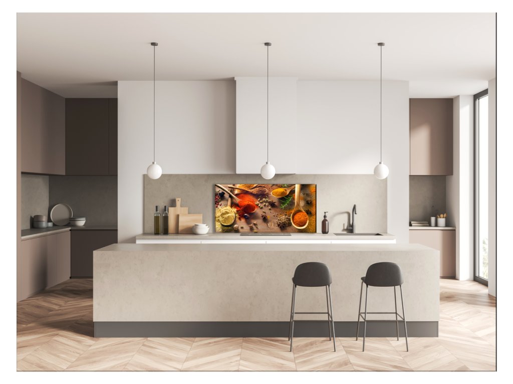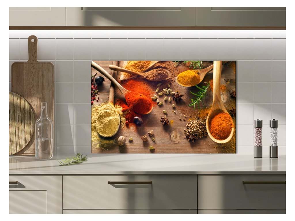 - použití: skleněný panel do kuchyně je vhodný za varné centrum elektrické, indukci i plynové. V případě umístění za plynovou varnou desku doporučujeme minimální vzdálenost 15 cm od hořáků, popř. nepouštět naplno a udržovat plamen pod hrncem hlavně u velkého hořáku. V případě nedodržení instrukcí, může dojít k poškození potisku či barvy výrobku