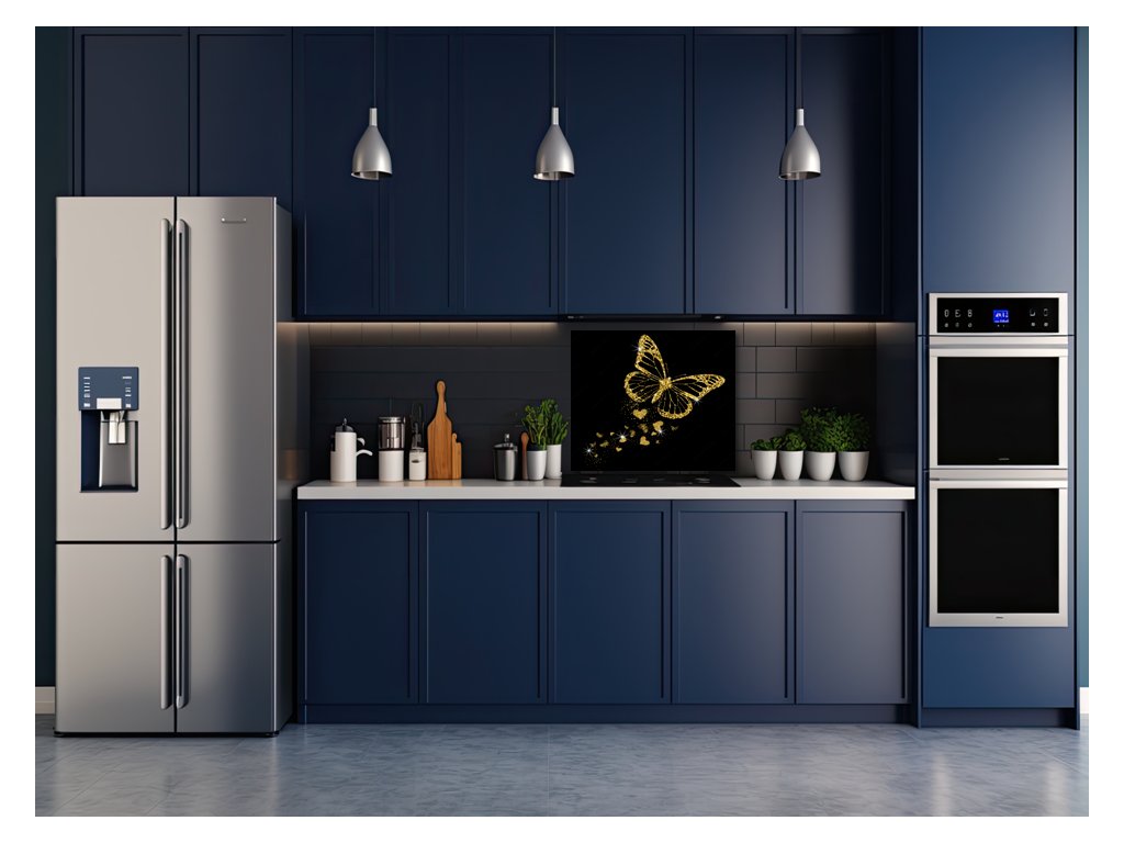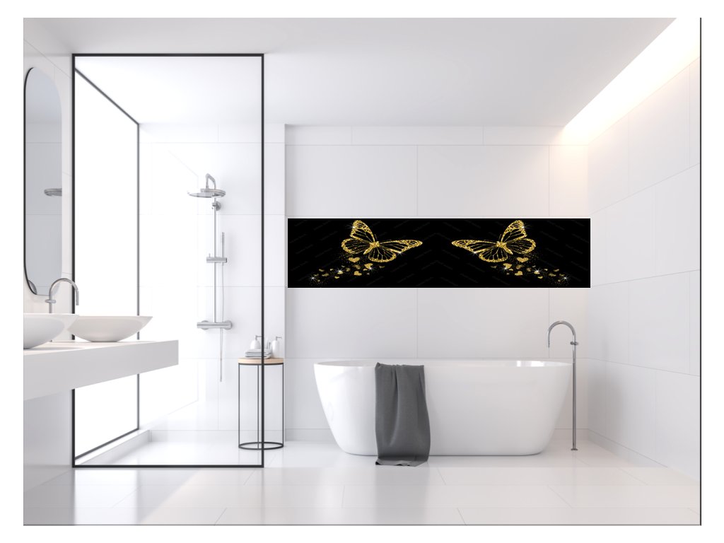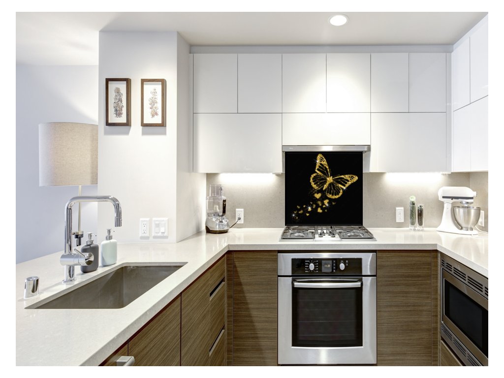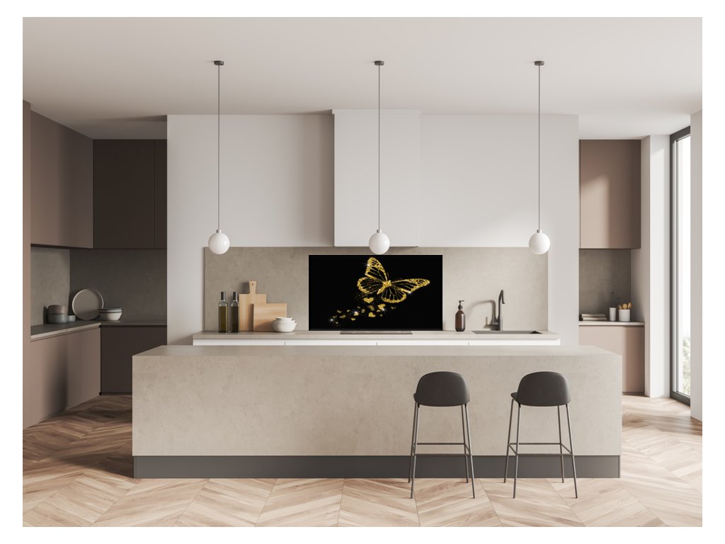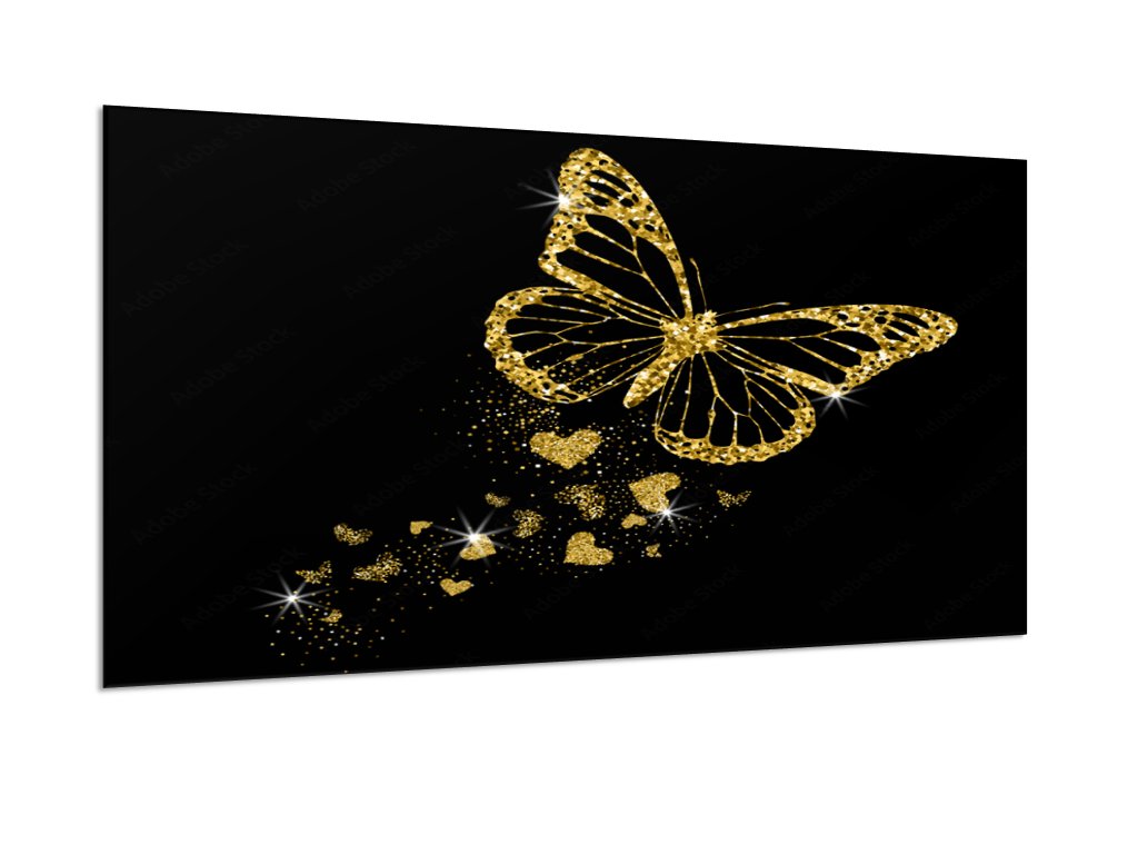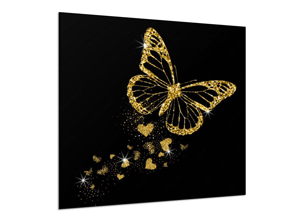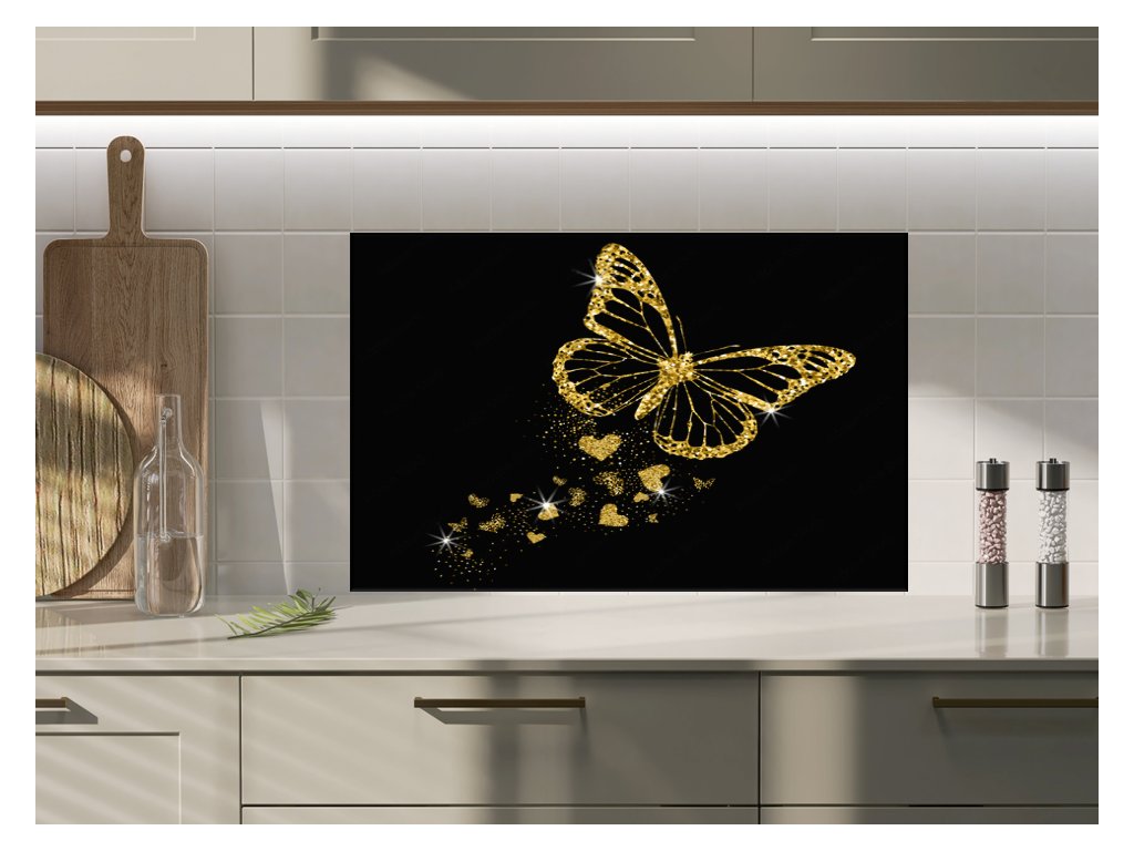 Sklo do kuchyně luxusní zlatý motýl a záře srdíček