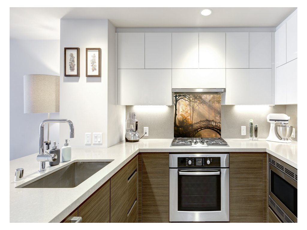 - použití: skleněný panel do kuchyně je vhodný za varné centrum elektrické, indukci i plynové. V případě umístění za plynovou varnou desku doporučujeme minimální vzdálenost 15 cm od hořáků, popř. nepouštět naplno a udržovat plamen pod hrncem hlavně u velkého hořáku. V případě nedodržení instrukcí, může dojít k poškození potisku či barvy výrobku